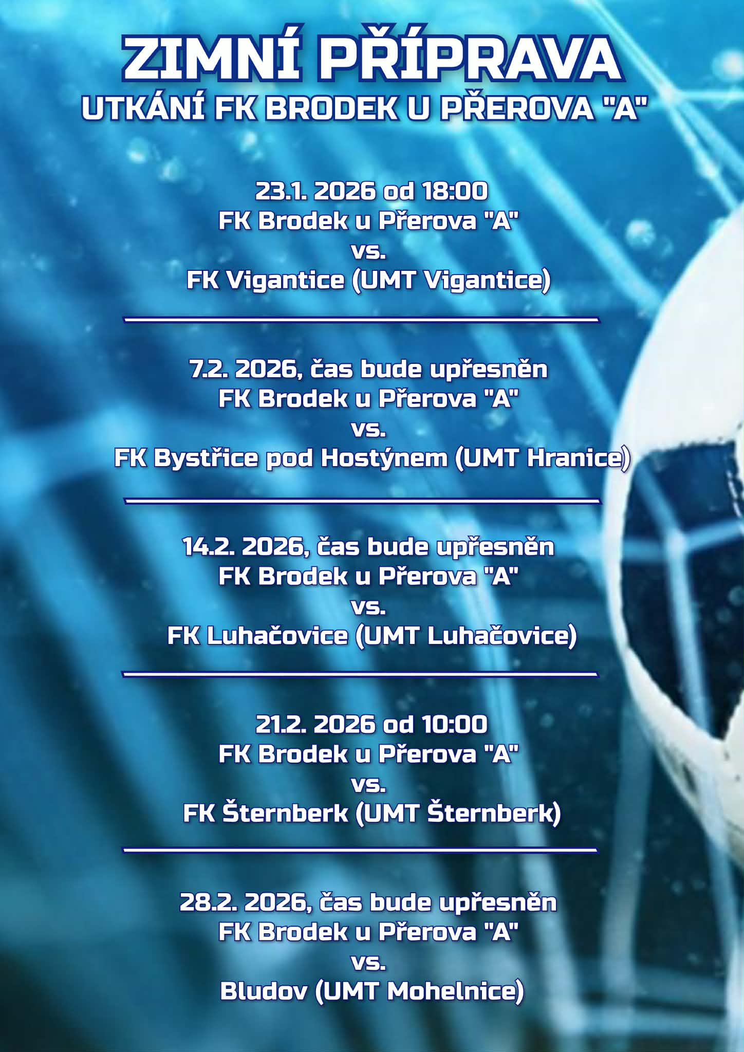 Fotbalová školička > U6 Pokud je ti 3 a více roků, dojdi za námi v úterý a čtvrtky od 17:30 hod. pondělí, středa Mladší přípravka > U8, pondělí, středa Starší přípravka > U11. pondělí a středy od 17:30 hod. Úterý a čtvrtek od 16:30 hod. Starší žáci > U15. Vždy na hřišti FK Brodek u Přerova. Vstup z ulice Tyršova, od sokolovny i od multifunkčního hřiště. V zimním období tréneujeme ve školní tělocvičně. Dny a časy tréninků se mohou lišit.